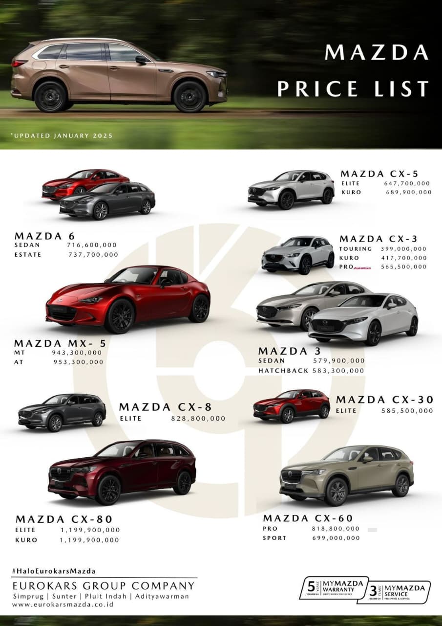 Rasakan Sensasi Berkendara Anda dengan Melakukan Test Drive di dealer Mazda di kota anda Sebelum anda melakukan pembelian, Biar anda bisa lebih Yakin kenapa Mazda Saat Ini sudah banyak anda jumpai di berbagai jalan ibu kota. dengan Fakta Ini Semua Bahwa Teknology, Saftey dan interior yang merupakan Pabrikan Jepang Tapi Kualitas Sudah Standart mobil EROPA.
